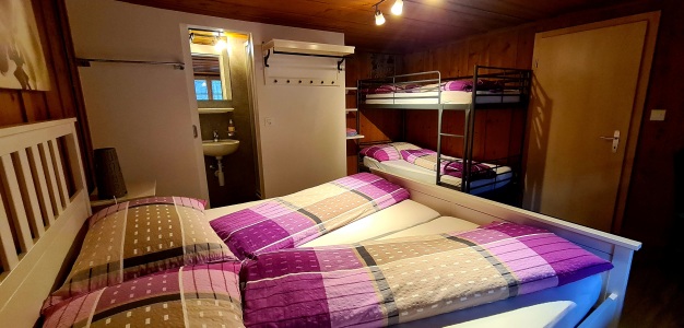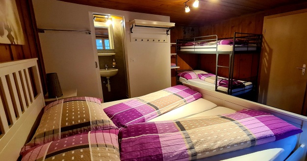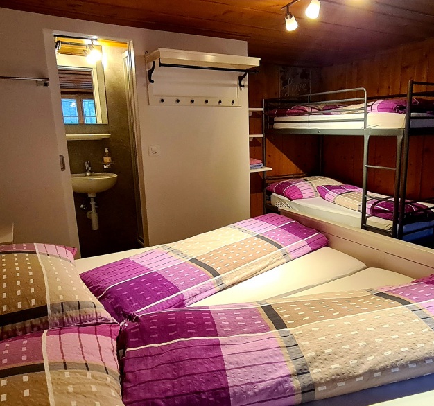 Unser Familienzimmer verfügt über 1 Doppelbett und einem Etagen-Bett. Ideal für Familien mit 2 Kindern. Mit Zustellbett können sogar 5 Personen im Zimmer übernachten. Dusche/WC ist im Zimmer integriert und verfügt über W-lan.
